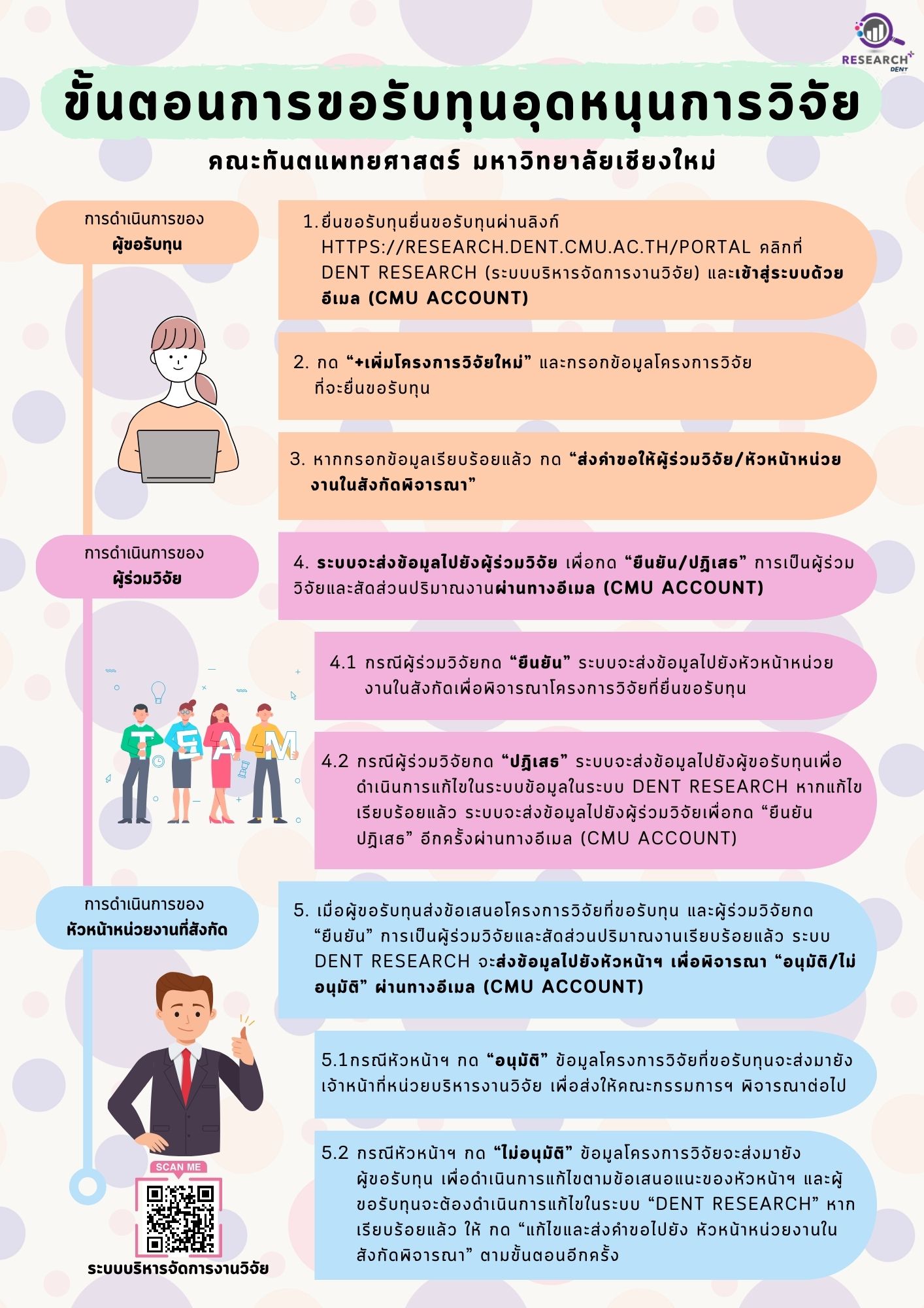 6. ผู้สนใจสมัครขอรับทุนฯ โปรดยื่นขอรับทุนแบบออนไลน์ผ่านทาง https://research.dent.cmu.ac.th/portal คลิกที่ Dent Research (ระบบบริหารจัดการงานวิจัย) และเข้าสู่ระบบด้วยอีเมล CMU Account ได้ตั้งแต่บัดนี้ จนถึงวันที่ 5 กันยายน 2568