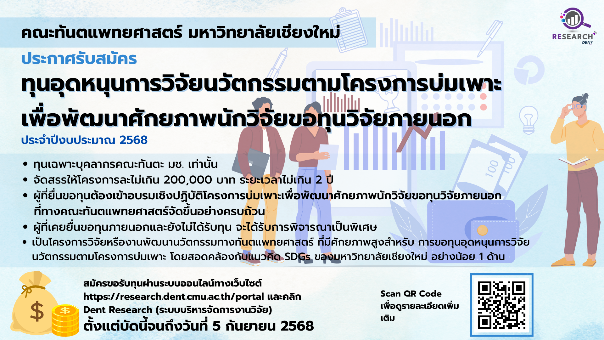คณะทันตแพทยศาสตร์ มหาวิทยาลัยเชียงใหม่ ประกาศเปิดรับสมัครทุนอุดหนุนการวิจัยนวัตกรรม